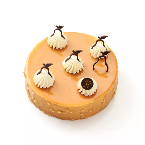 Mousse intensément vanille, compotée de poires, caramel beurre salé, génoise blanche, pâte sablée