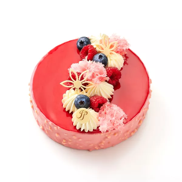 Génoise Savoie, crème fraîche, fruits frais, contour massepain (Possibilité de faire contour en copeaux de chocolat, ou coulé chocolat)