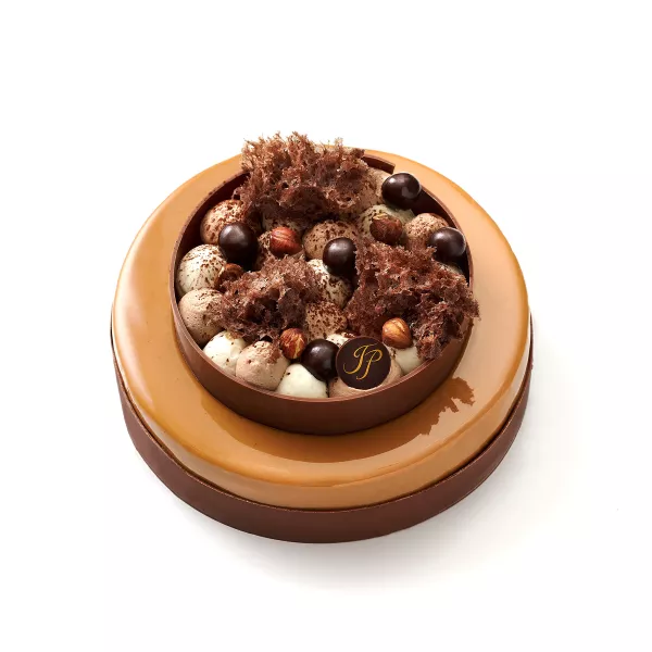Mousse chocolat au lait, crème brûlée à la vanille, dacquoise aux noisettes, fond croustillant