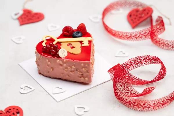 Mousse chocolat blanc, confit de griottes / framboises, génoise aux amandes