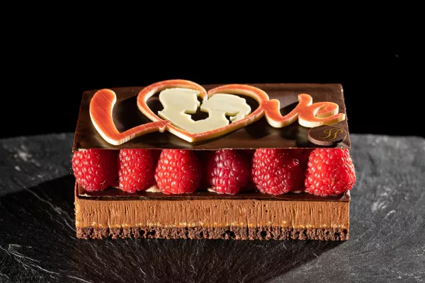 Mousse au chocolat, crémeux framboises, biscuit au chocolat, fond croustillant